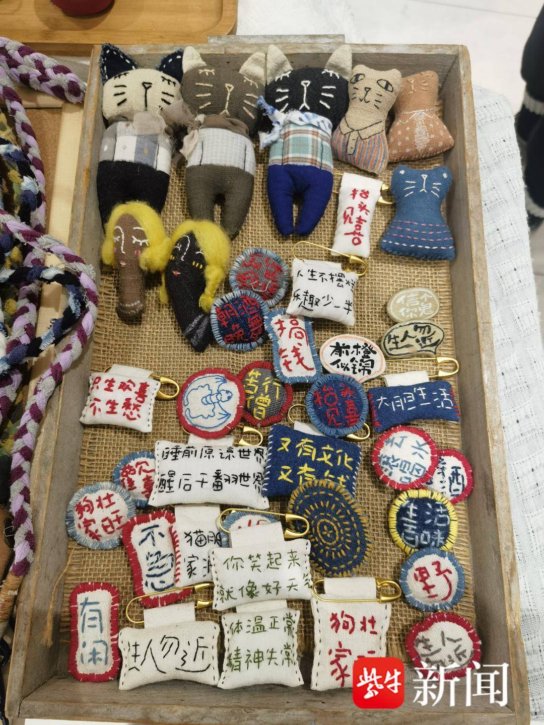 “搞钱”“只生欢喜不生愁”“不急”……摊位老板介绍,这些文字的内容自己参考了网络流行语,都是自己一针一线缝上去的。每个布艺小物件都有一枚金色别针,可以别在衣服或者包包上。正在购物的大学生小周告诉记者,这些小挂件有的十几元,有的二三十元,能买得起,主打一个“情绪价值”。摊位的老板介绍,并非只有年轻人喜欢这种小物件,各个年龄阶段都有人喜欢购买,可能是被这些俏皮的文字打动了,给生活带来一些调剂。