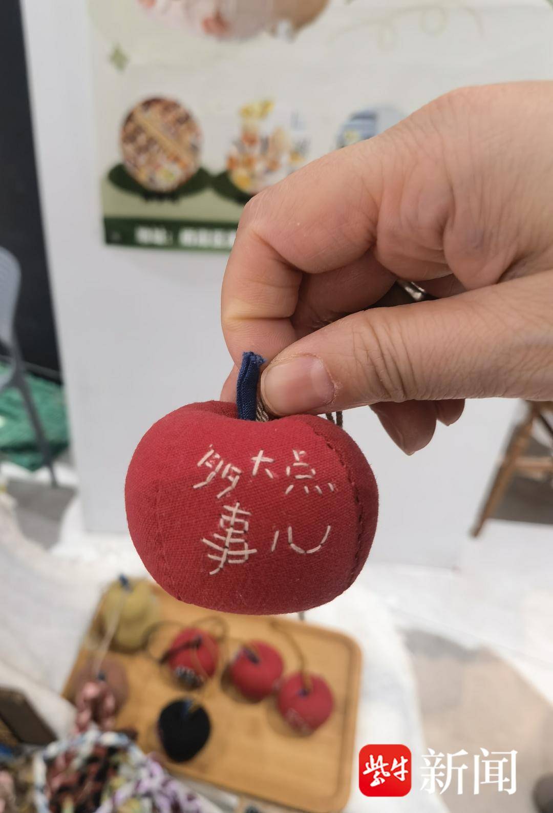 老板介绍,这些小饰品中最受欢迎的是红苹果。“临近年底了,红色的饰品比较喜庆。”她也会围绕着其他水果布艺挂件想一些创意,比如梨子形状的,就缝上“不离不弃”“自在”。